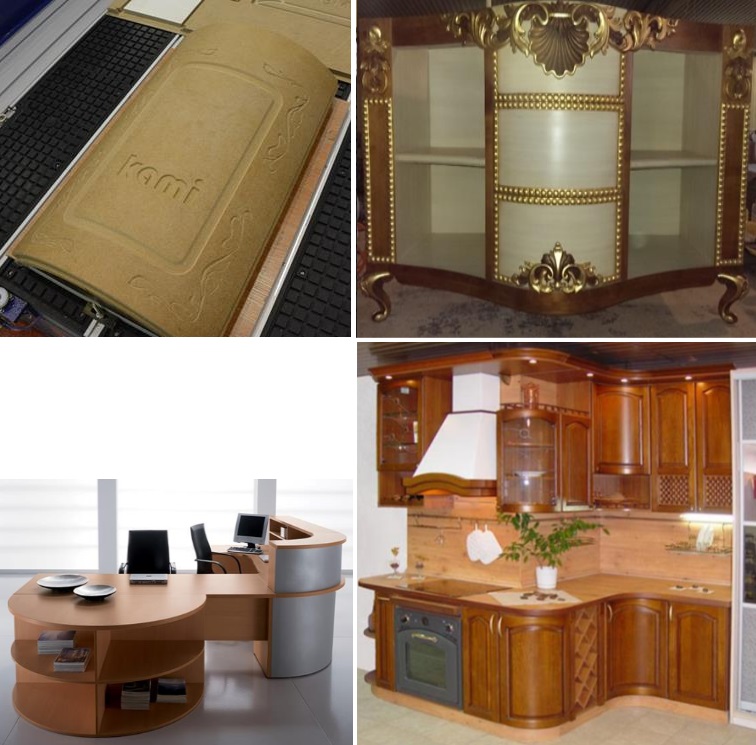 Простые и сложные фасады (в том числе с художественной резьбой на радиусных фасадах), сложные накладки на мебель, элементы эксклюзивной мебели и интерьеров;