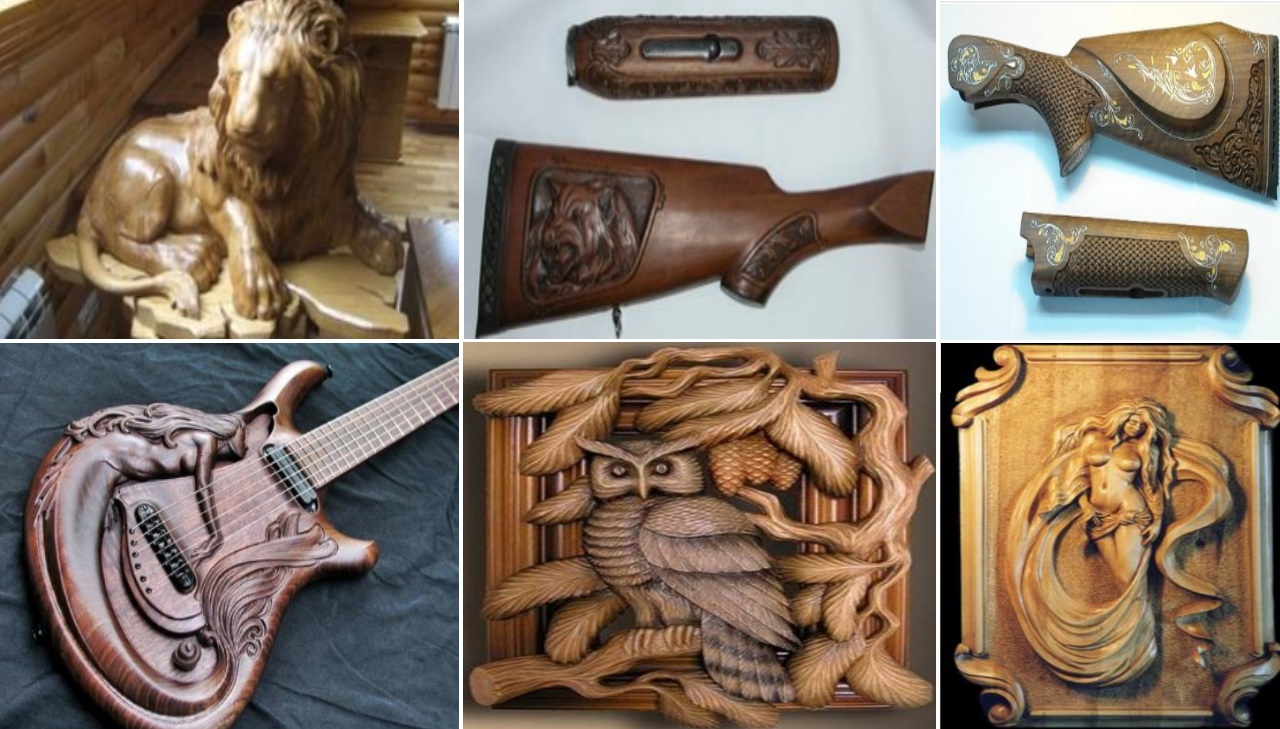 Рамы для зеркал, панно, изображения и скульптуры людей и животных, сувенирная продукция, шкатулки, письменные наборы, объемные логотипы, часы, оружейные приклады и ложе, музыкальные инструменты.